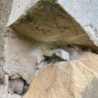 Door roestende doken werd de natuursteen opgedrukt en scheurde deze op verschillende plaatsen in. Een natuurlijk defect zorgde voor het afsplitsen van de latei boven de deur. Tijdens de werken werd de latei vastgezet met inox doken, het voegwerk werd hernomen en de natuursteen werd hersteld. Dit werd uitgevoerd met kalkmortel en inox doken.