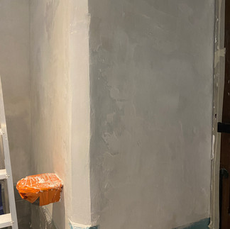 Daarna werden er drie lagen kalkverf aangebracht, waarbij de middelste werd aangevuld met zand om een structuur te creƫren.